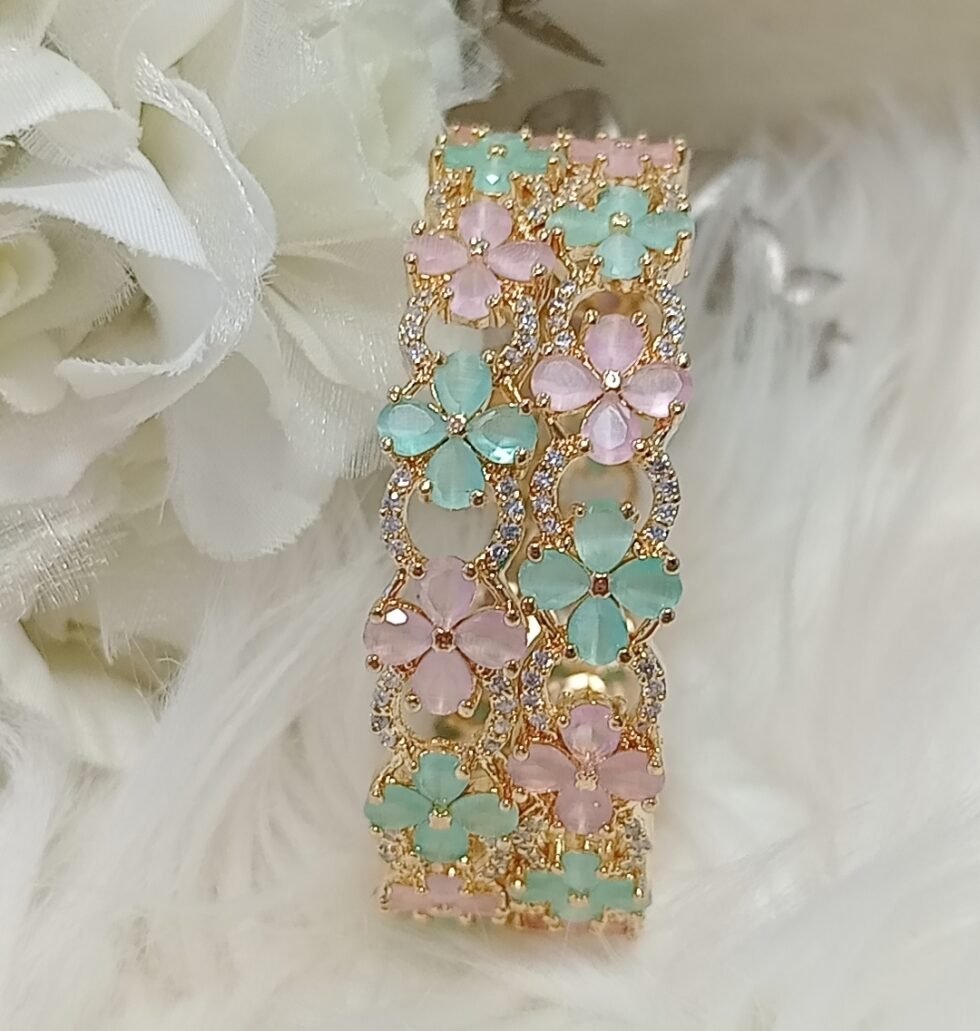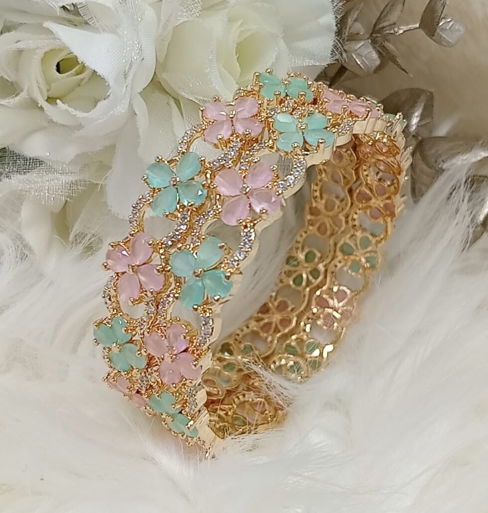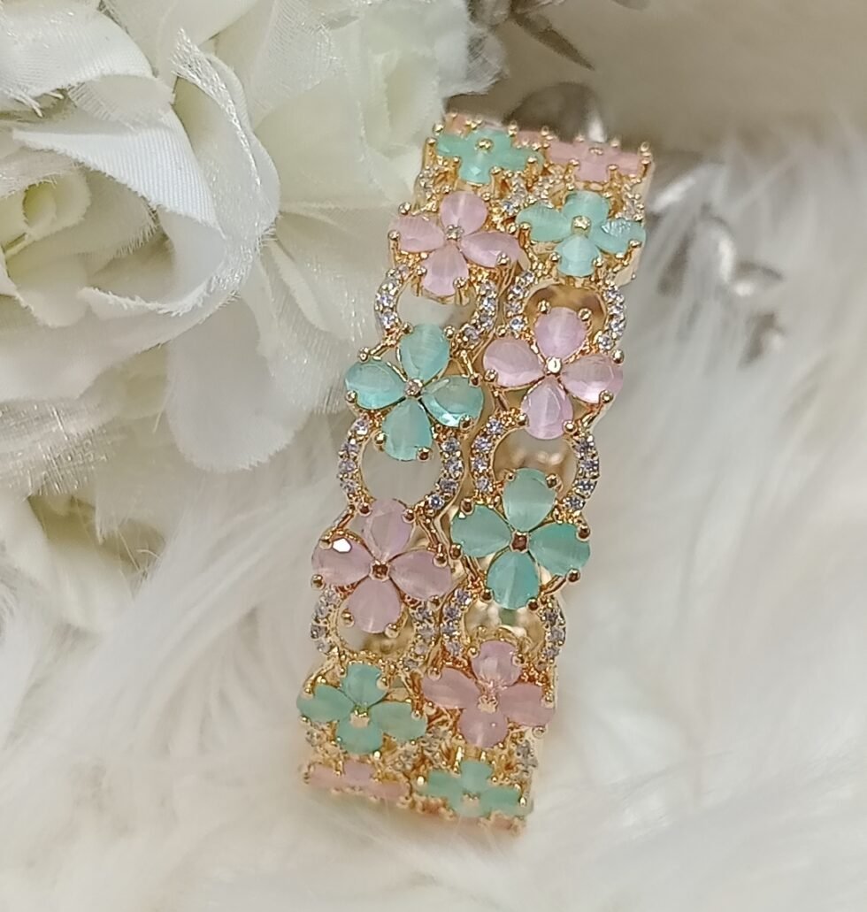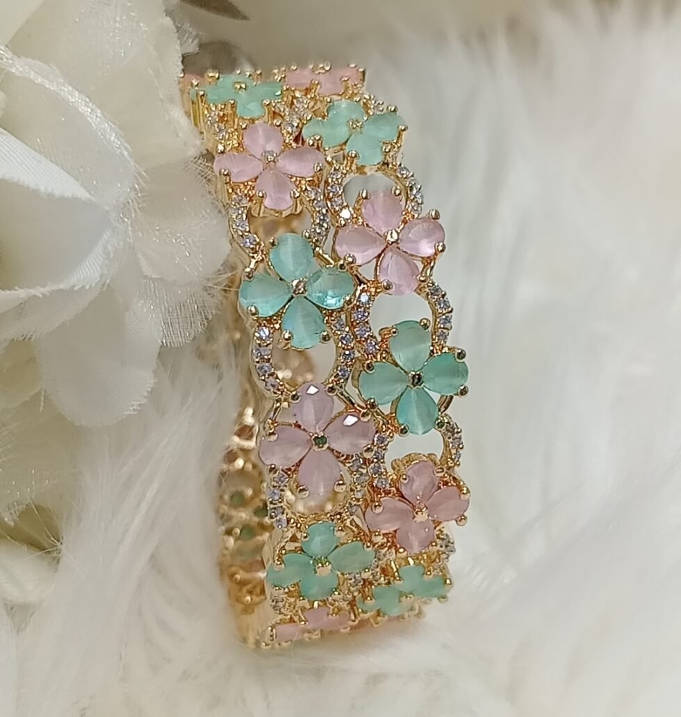 American Diamond Pink Green Gold Floral Bangle Set