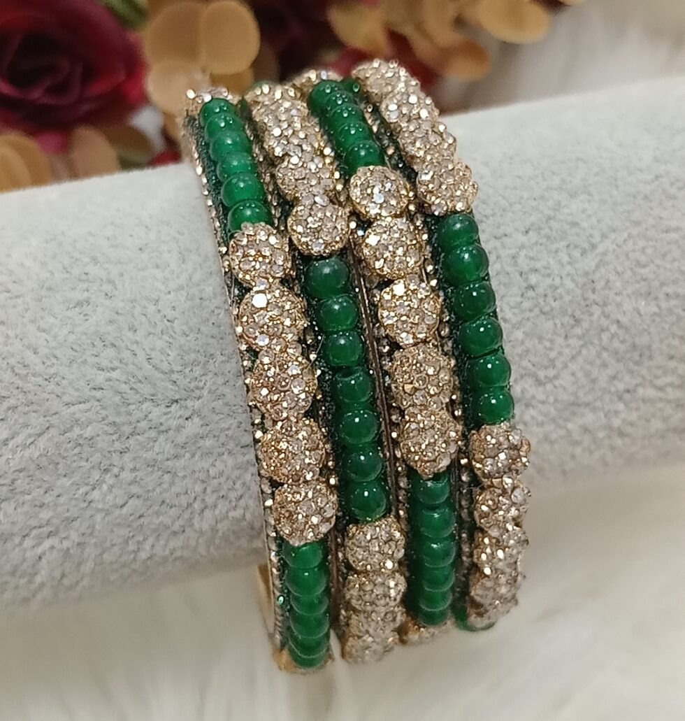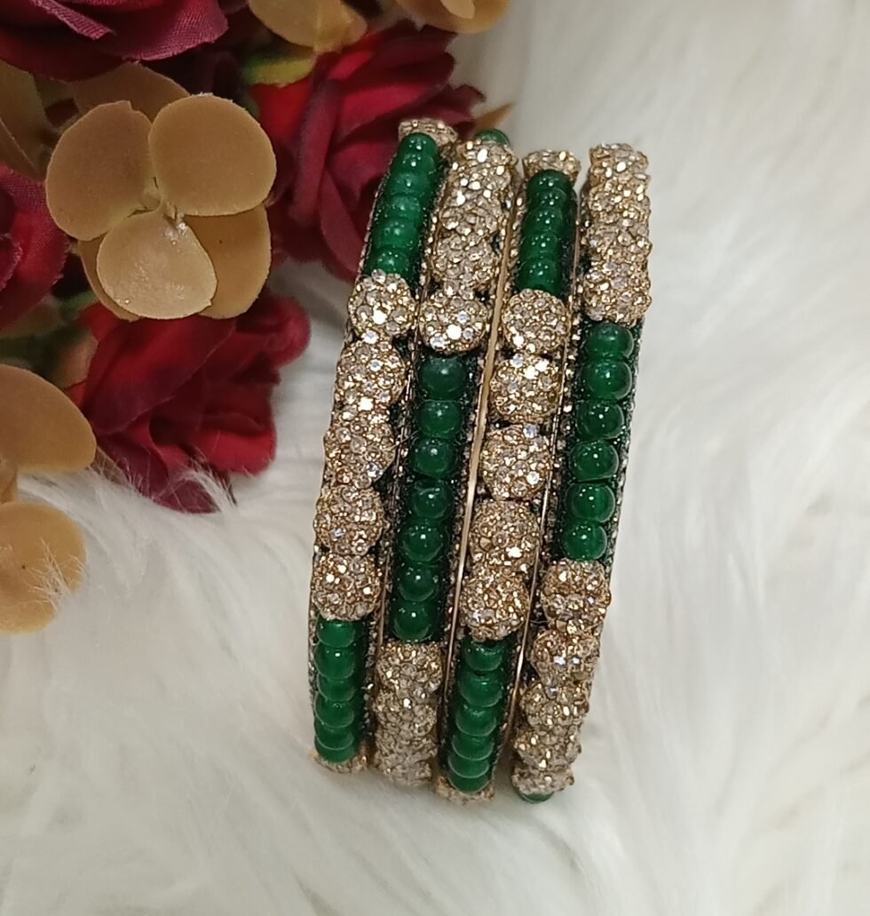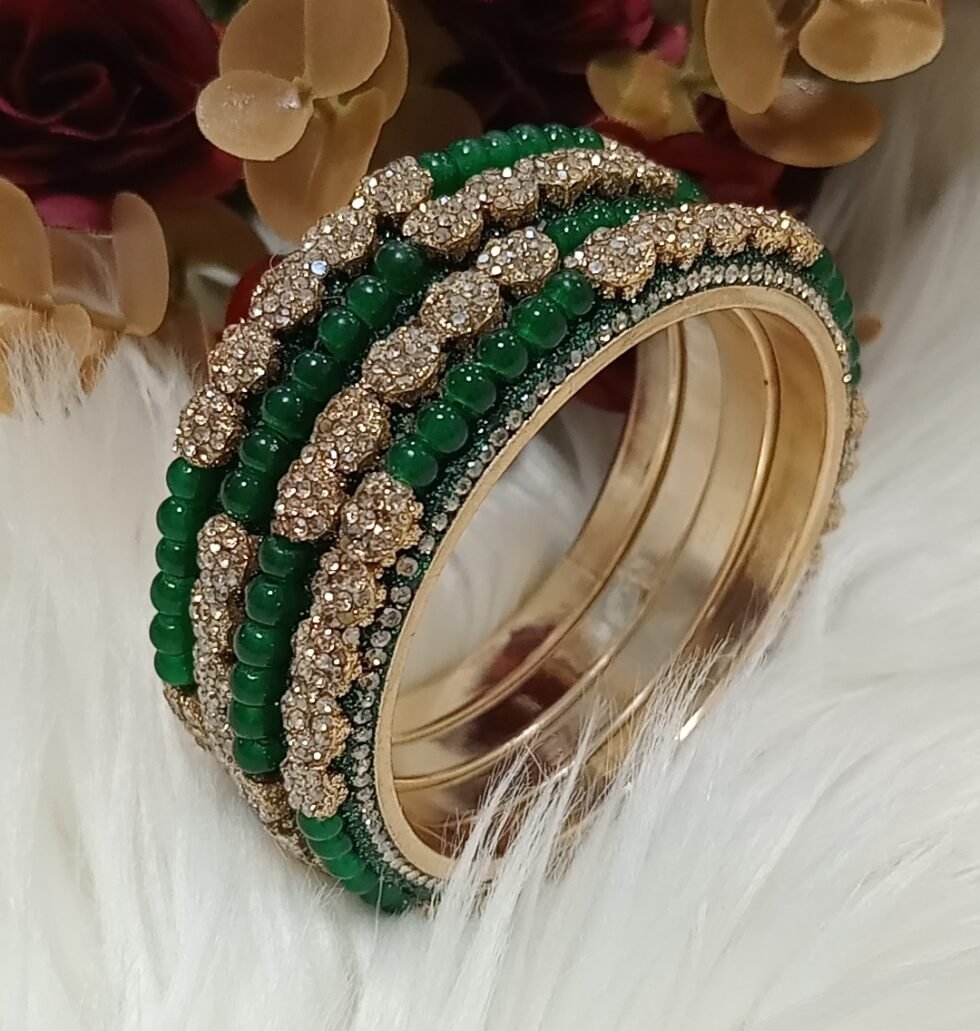 Exclusive Floral Emerald Green Gold Beaded 4pc Indian Bangle Set