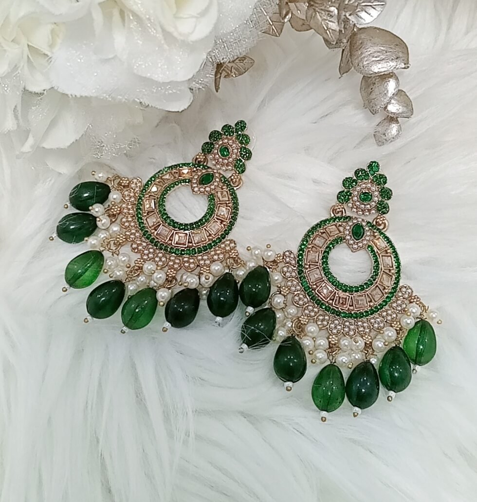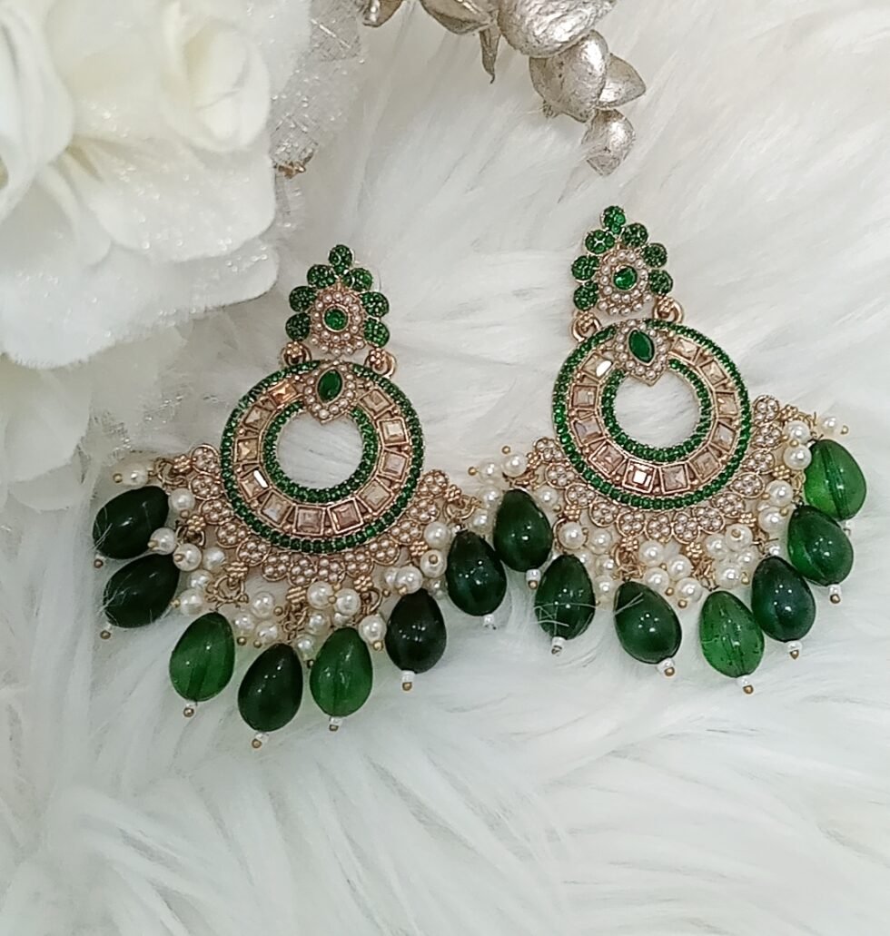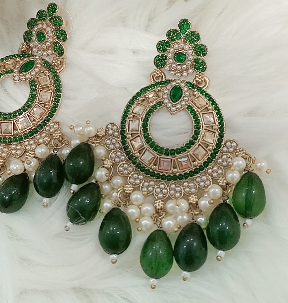 Forest Green Gold Pearl Chandbali Indian Earrings