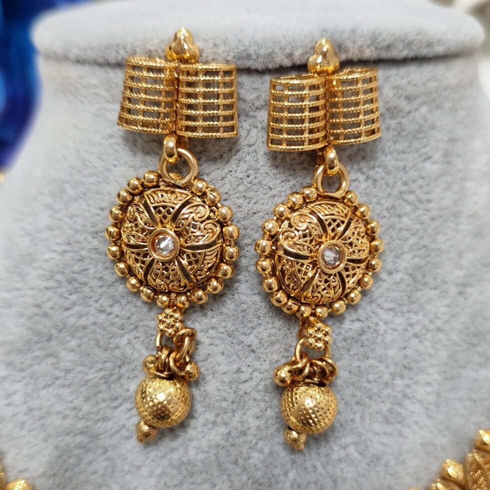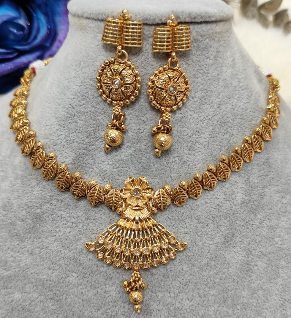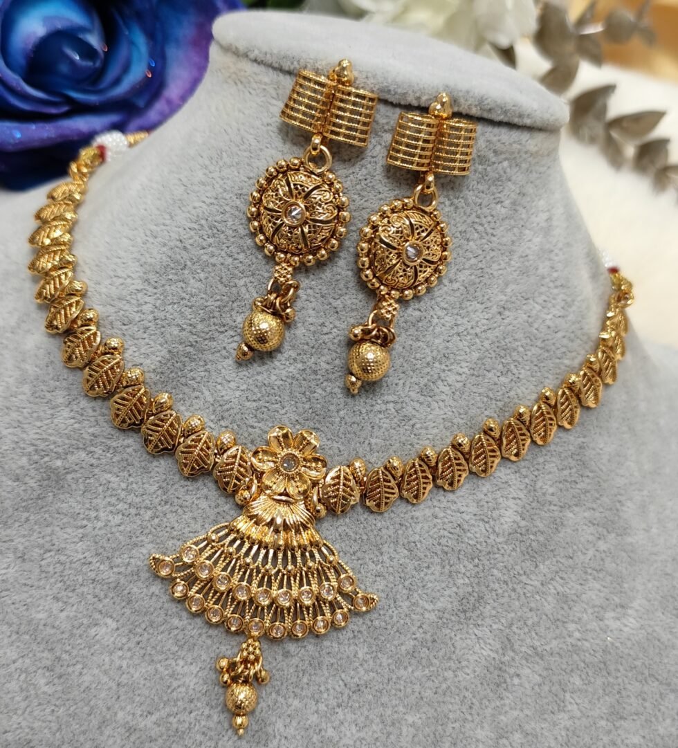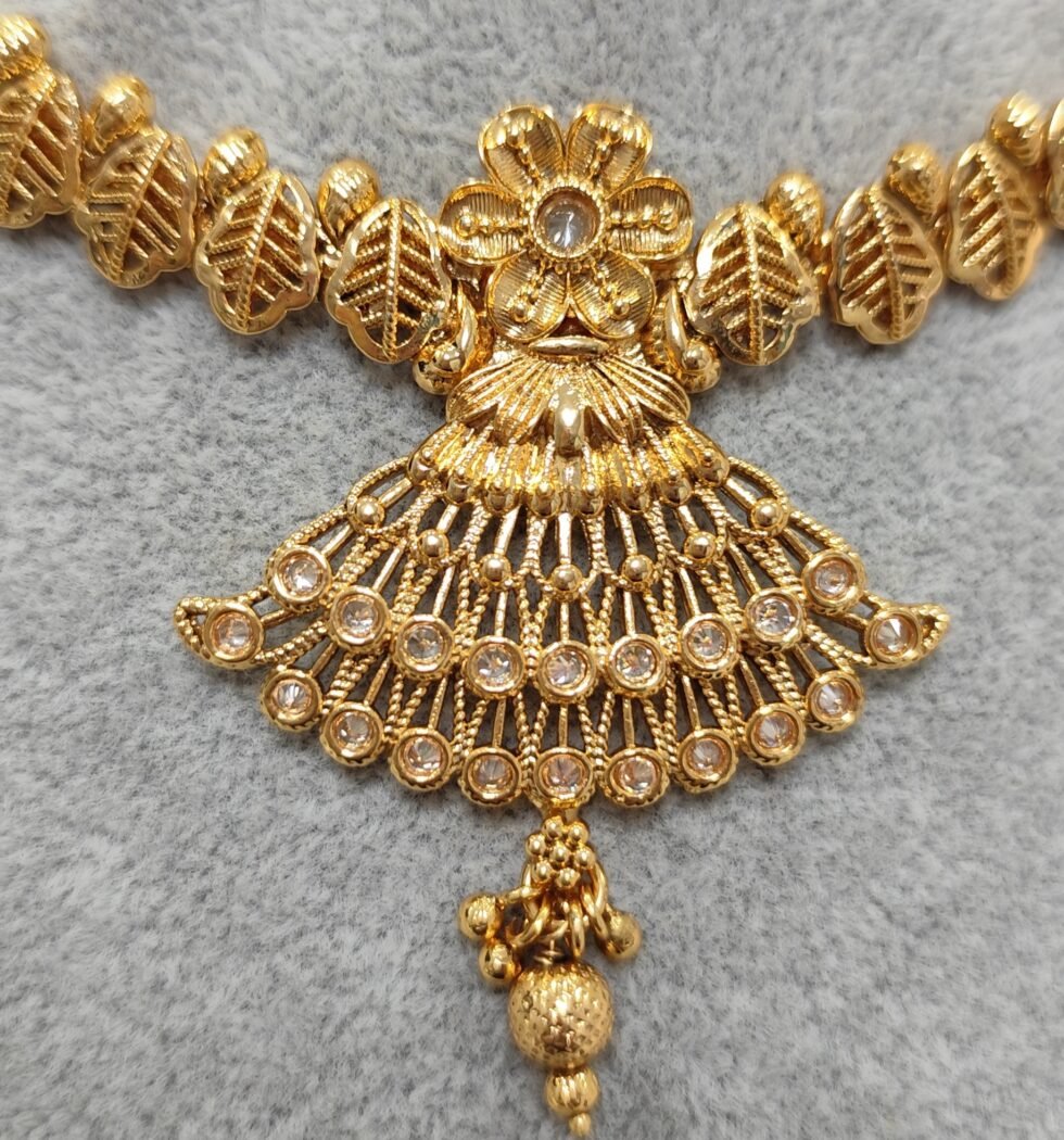 Perfect for pairing with sarees, lehengas, or Anarkali suits, this traditional Indian necklace set adds a regal touch to your festive or wedding wardrobe.
