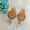 The necklace is designed in a classic round motif layout, making it ideal for bridal wear or festive occasions. The matching jhumkas showcase traditional dome shapes adorned with pastel accents and pearl hangings, enhancing their grandeur.