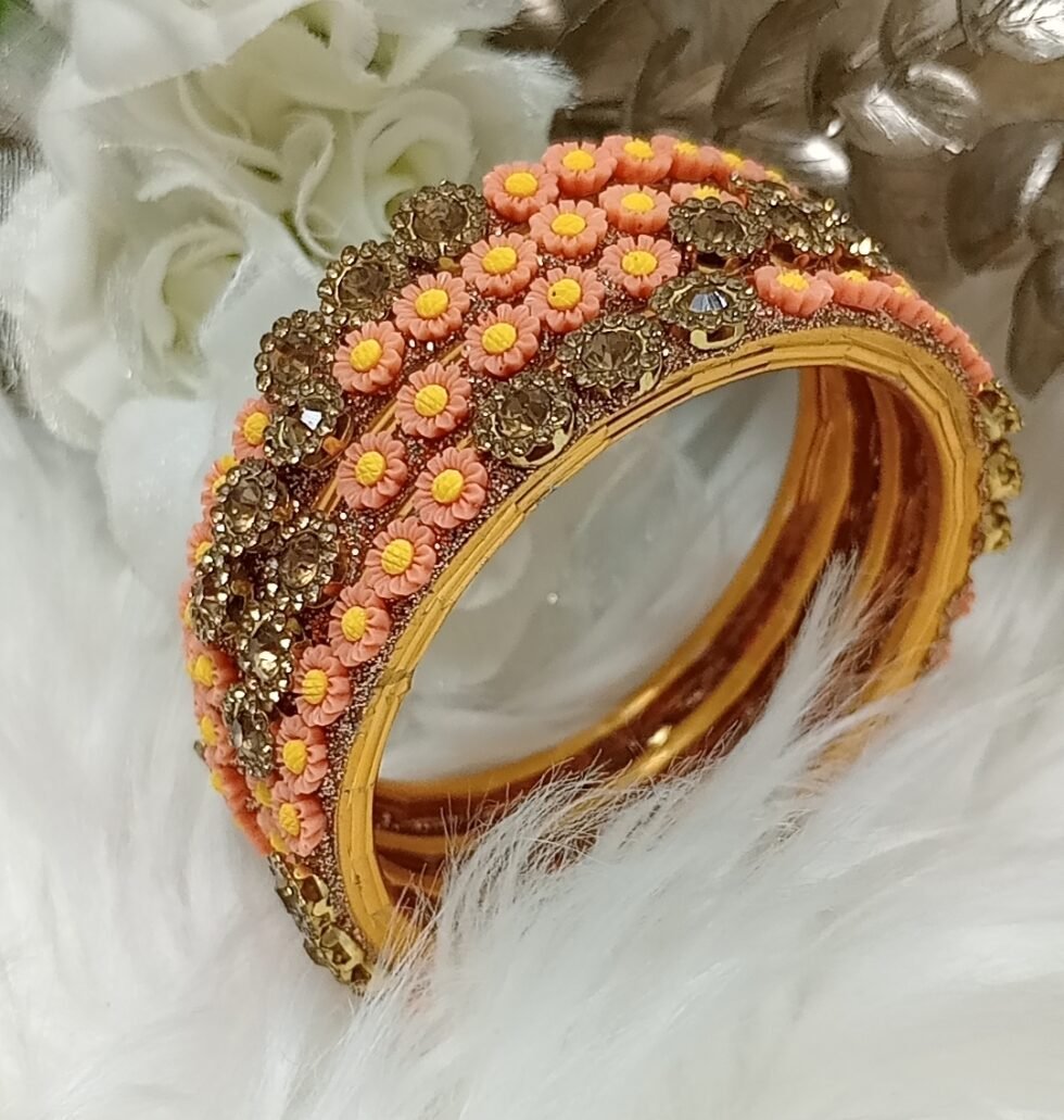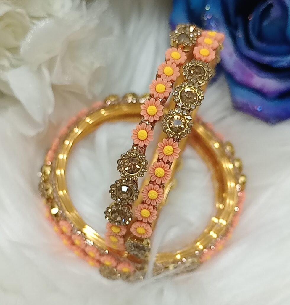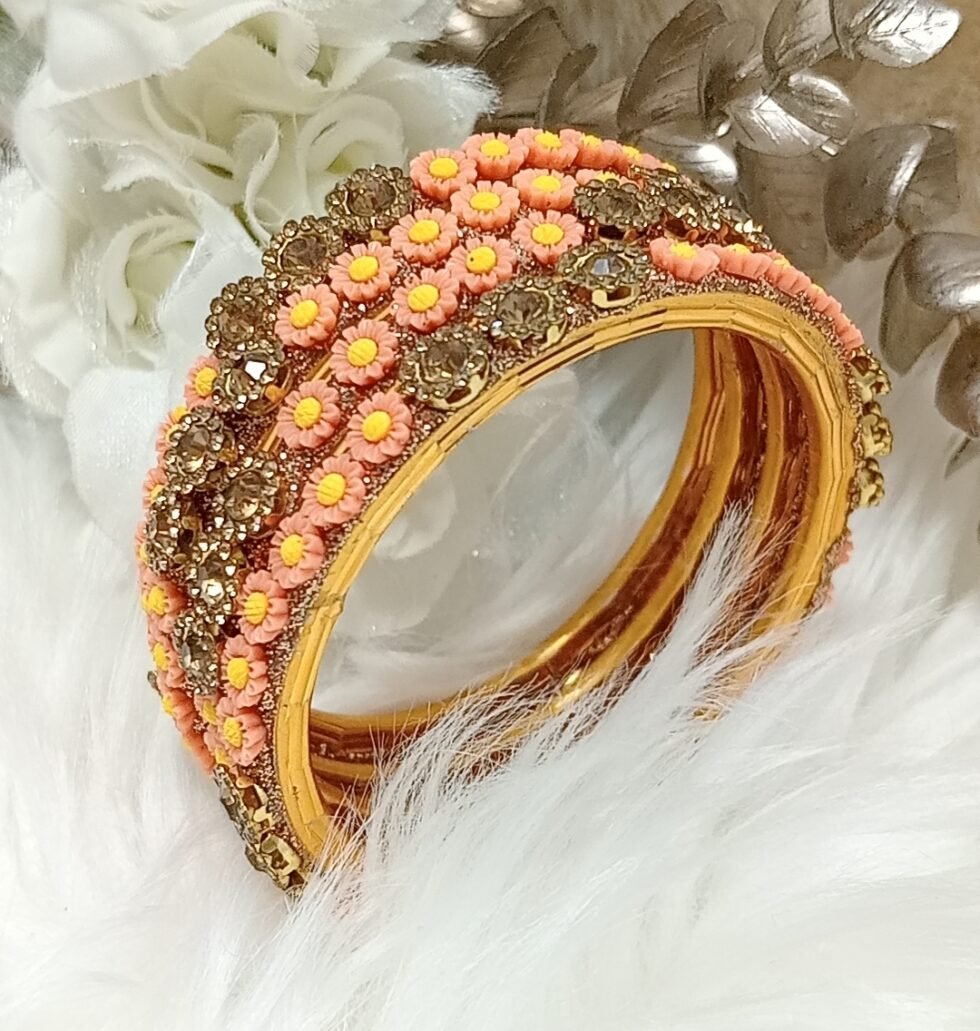 Mini Coral Pink Yellow Floral 4pc Indian Bangle Set