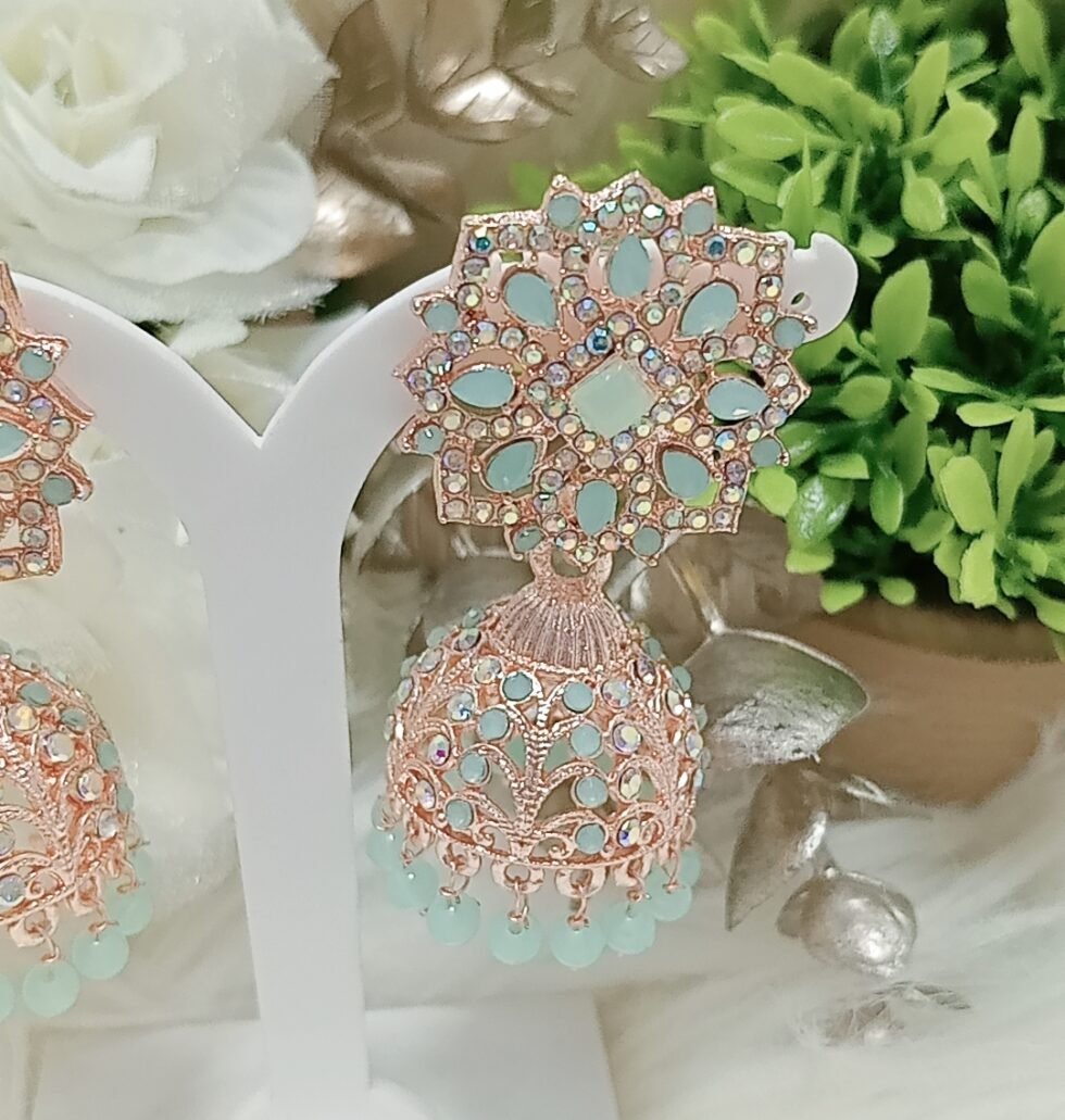 Perfect for festive events, weddings, and parties, these Moroccan Design Pink Rose Gold Jhumka Earrings offer a unique and graceful charm. Pair them with sarees, lehengas, or fusion outfits for a bold yet elegant statement.