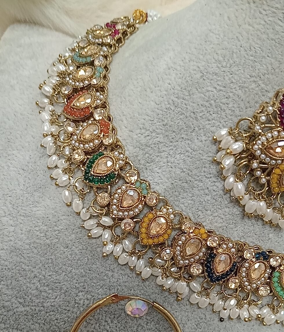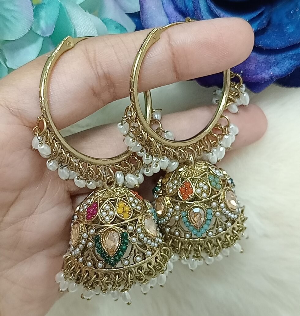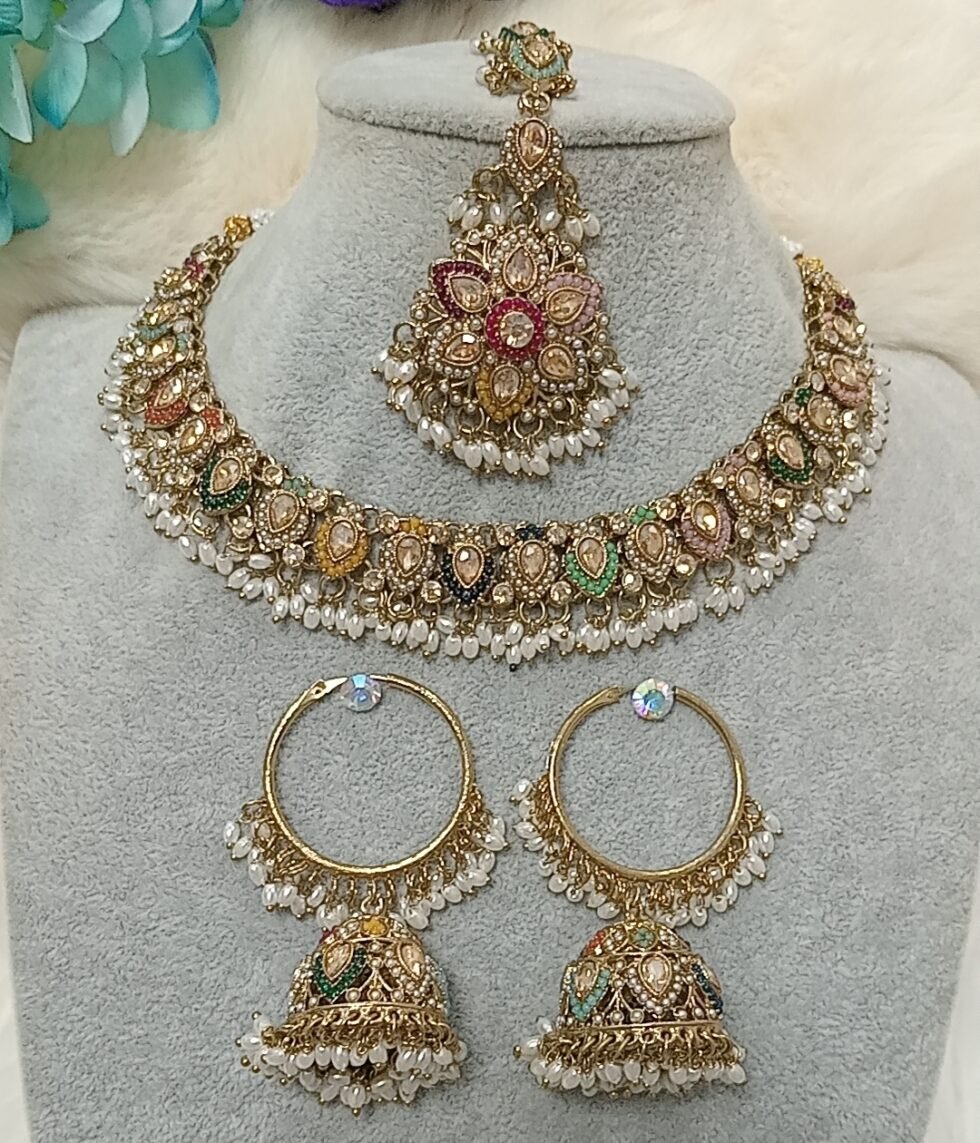 Multicolor Designer Indian Jewellery Set with Hoop Earrings and Maang Tikka