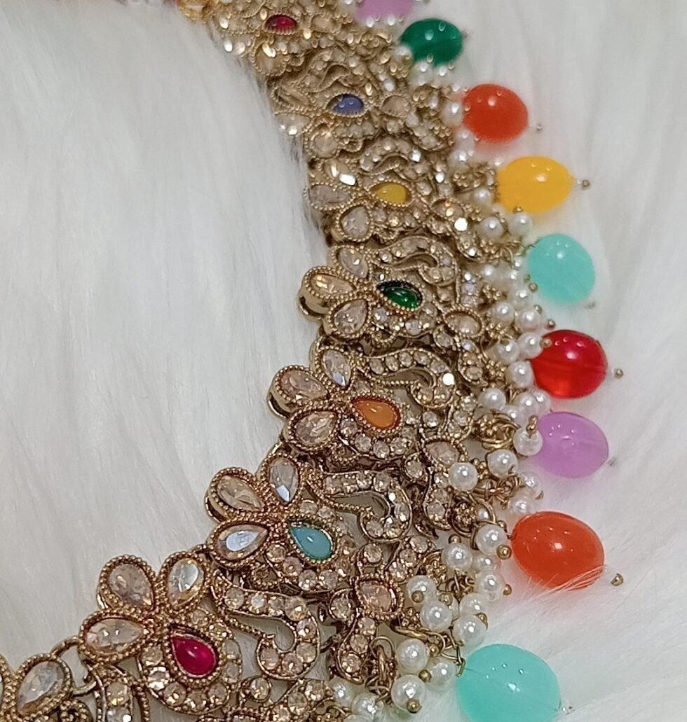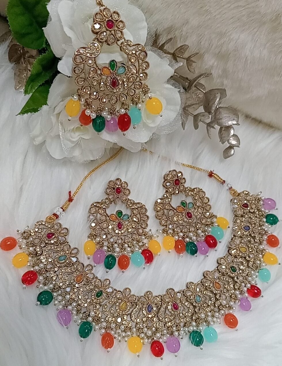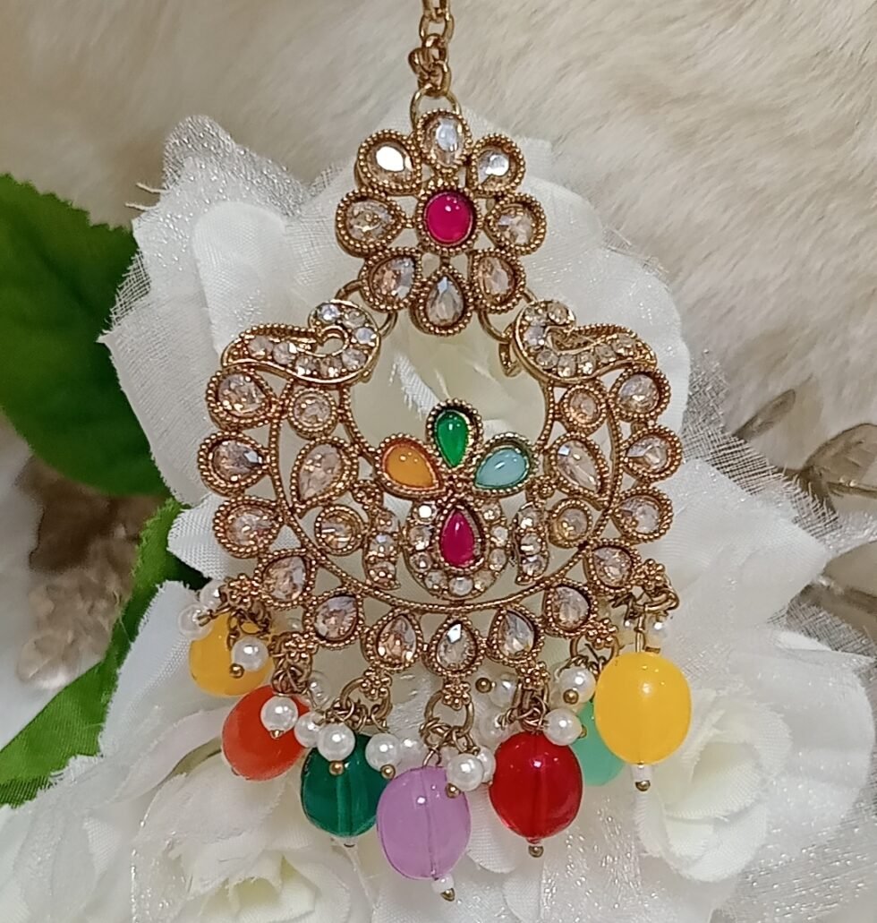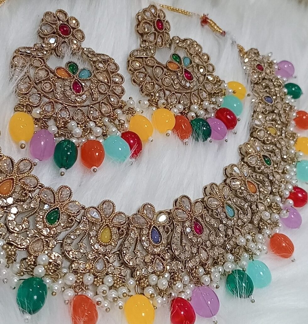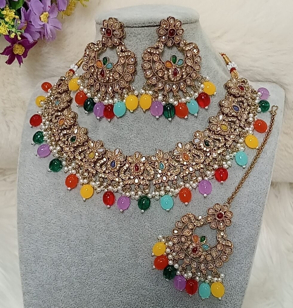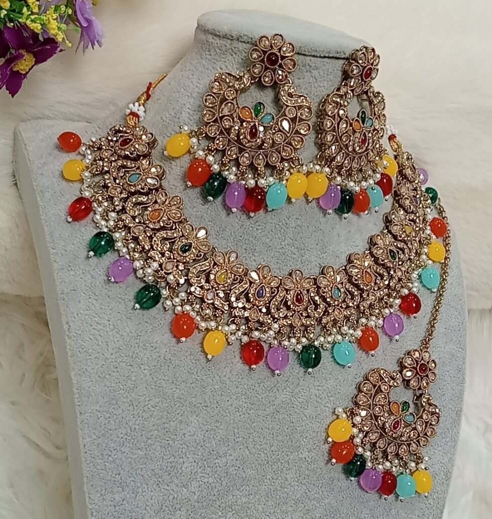Multicolor Pakistani Reverse AD Jewellery Set with Maang Tikka