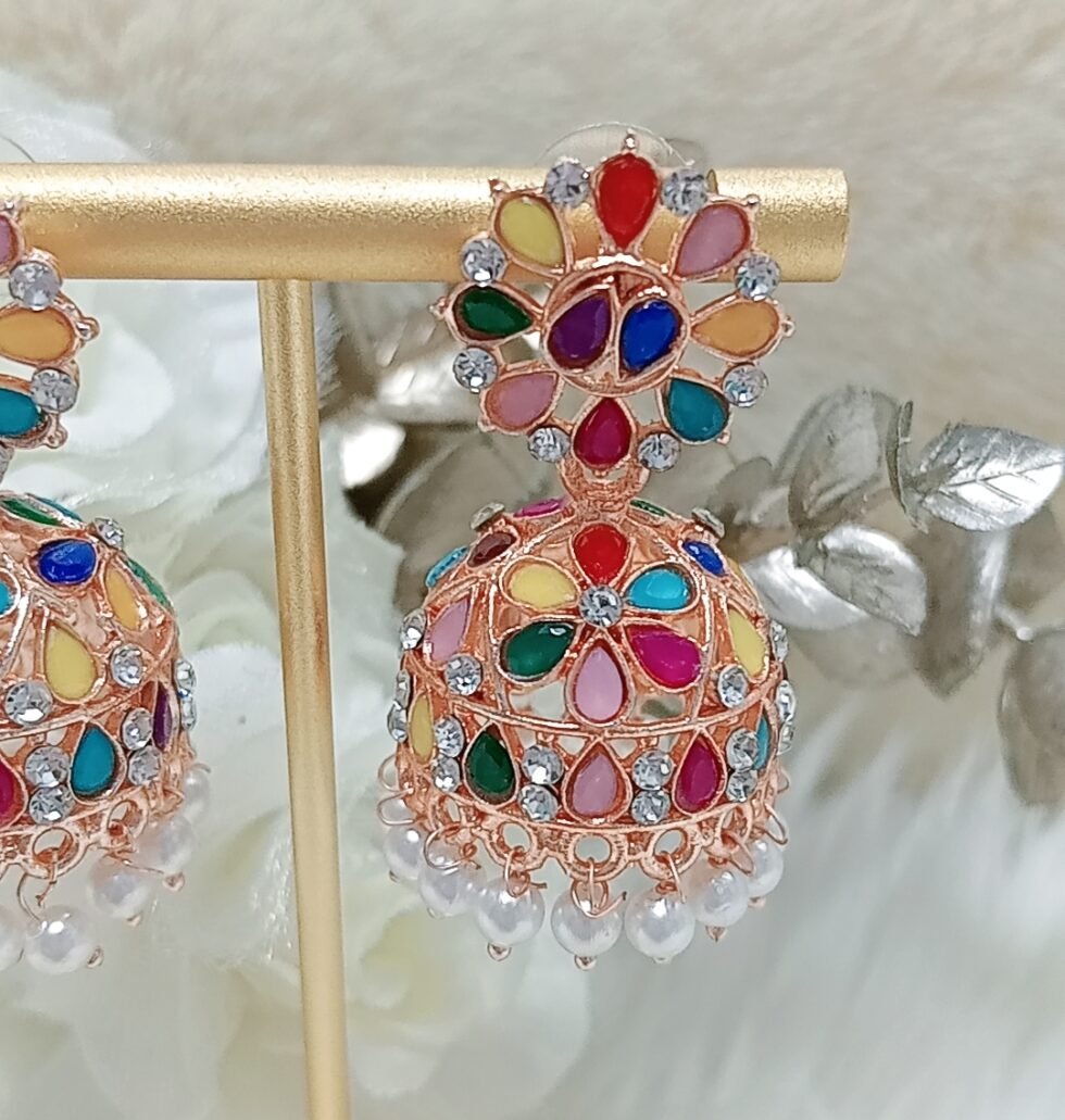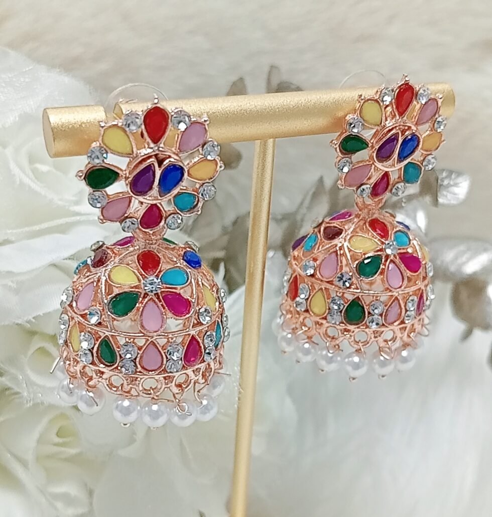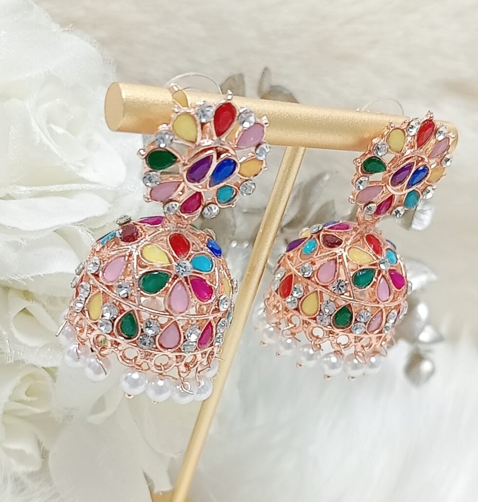 Perfect for festive events, weddings, and parties, these Moroccan Design Pink Rose Gold Jhumka Earrings offer a unique and graceful charm. Pair them with sarees, lehengas, or fusion outfits for a bold yet elegant statement.