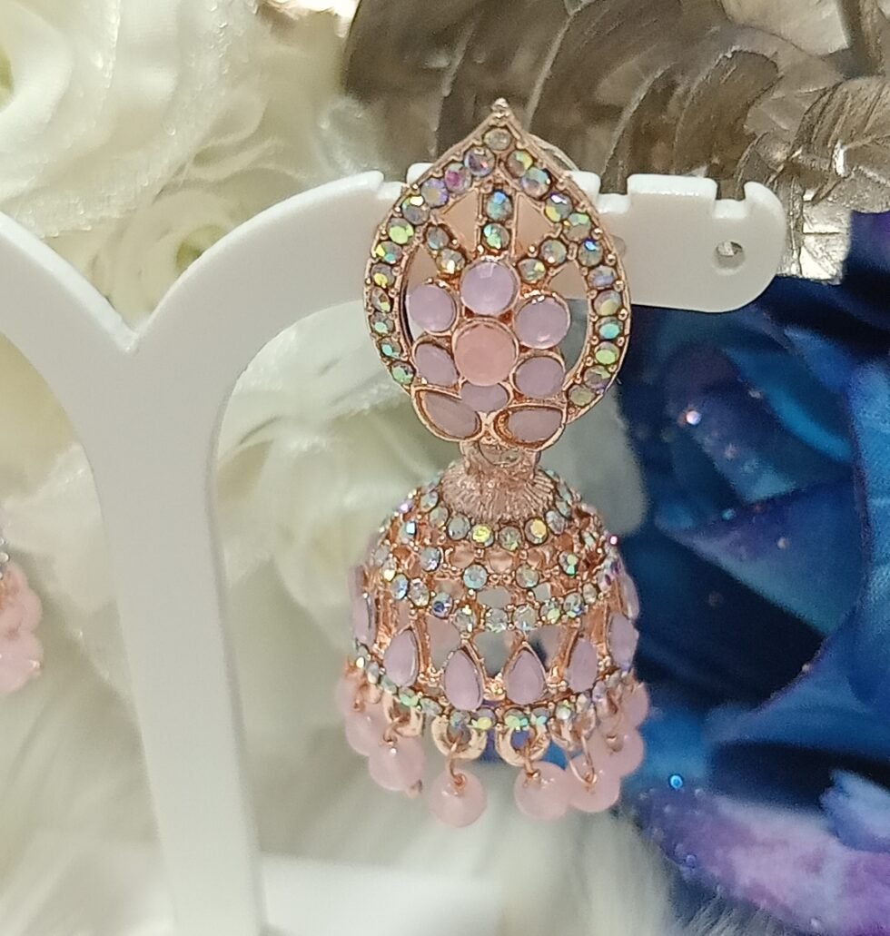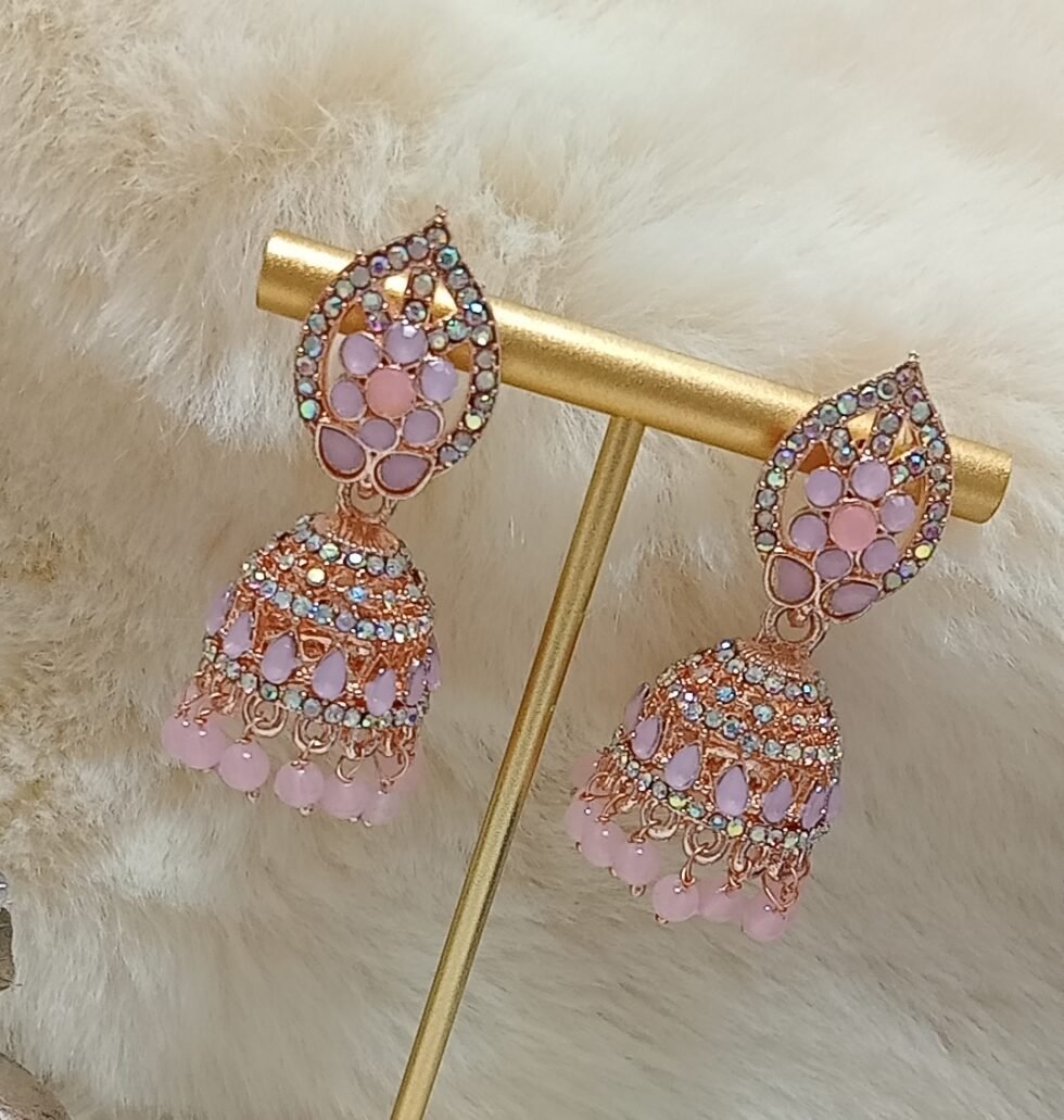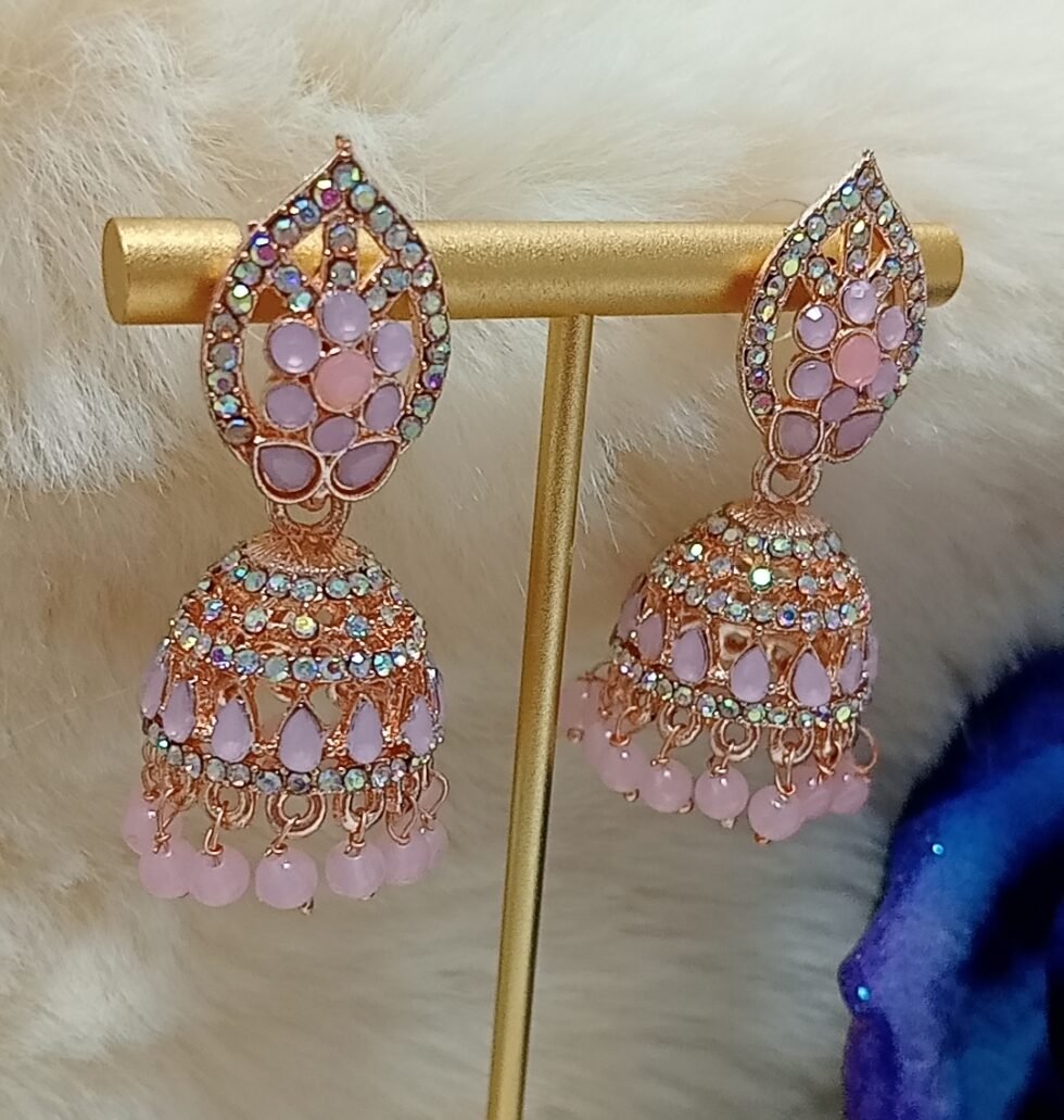 Perfect for festive events, weddings, and parties, these Moroccan Design Pink Rose Gold Jhumka Earrings offer a unique and graceful charm. Pair them with sarees, lehengas, or fusion outfits for a bold yet elegant statement.