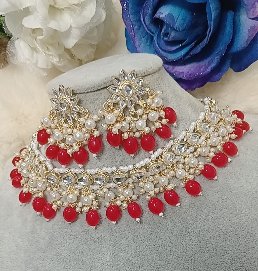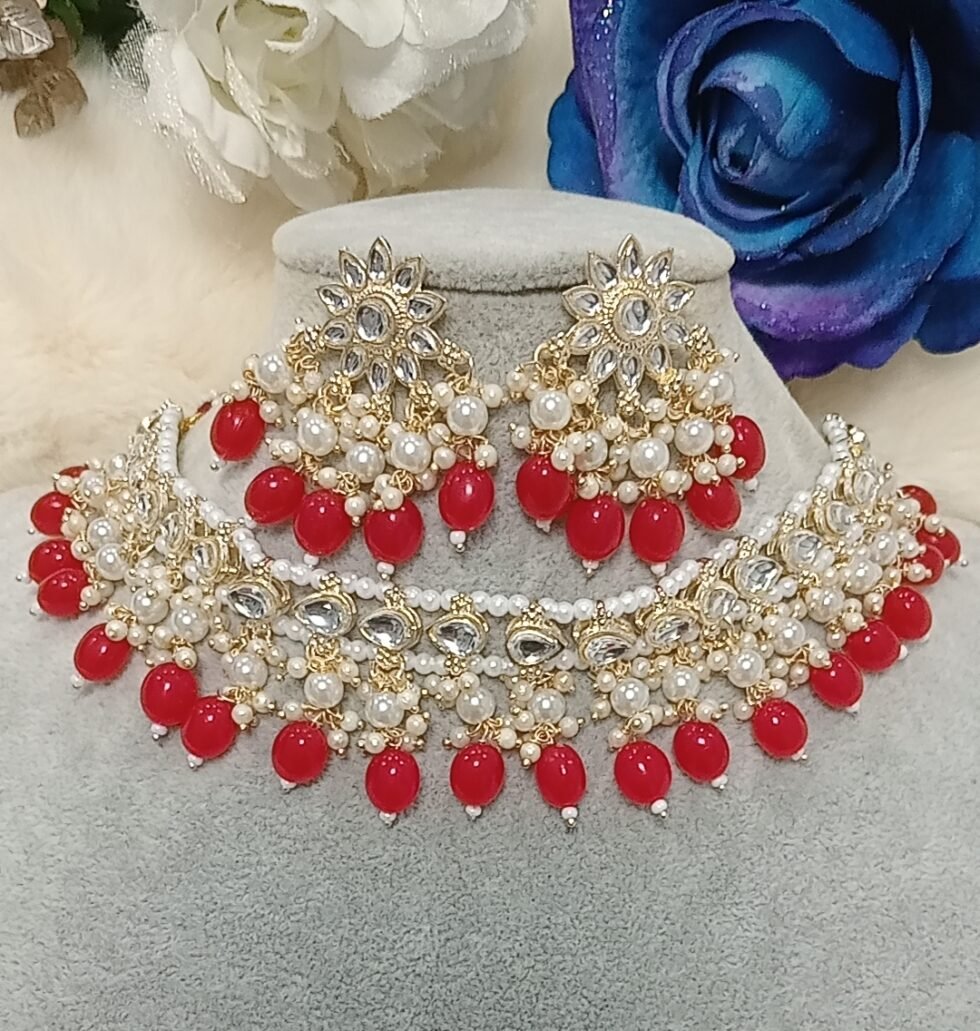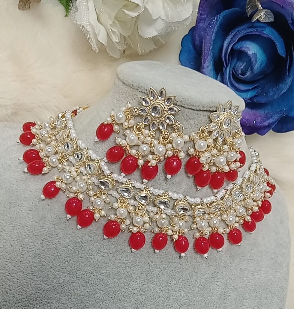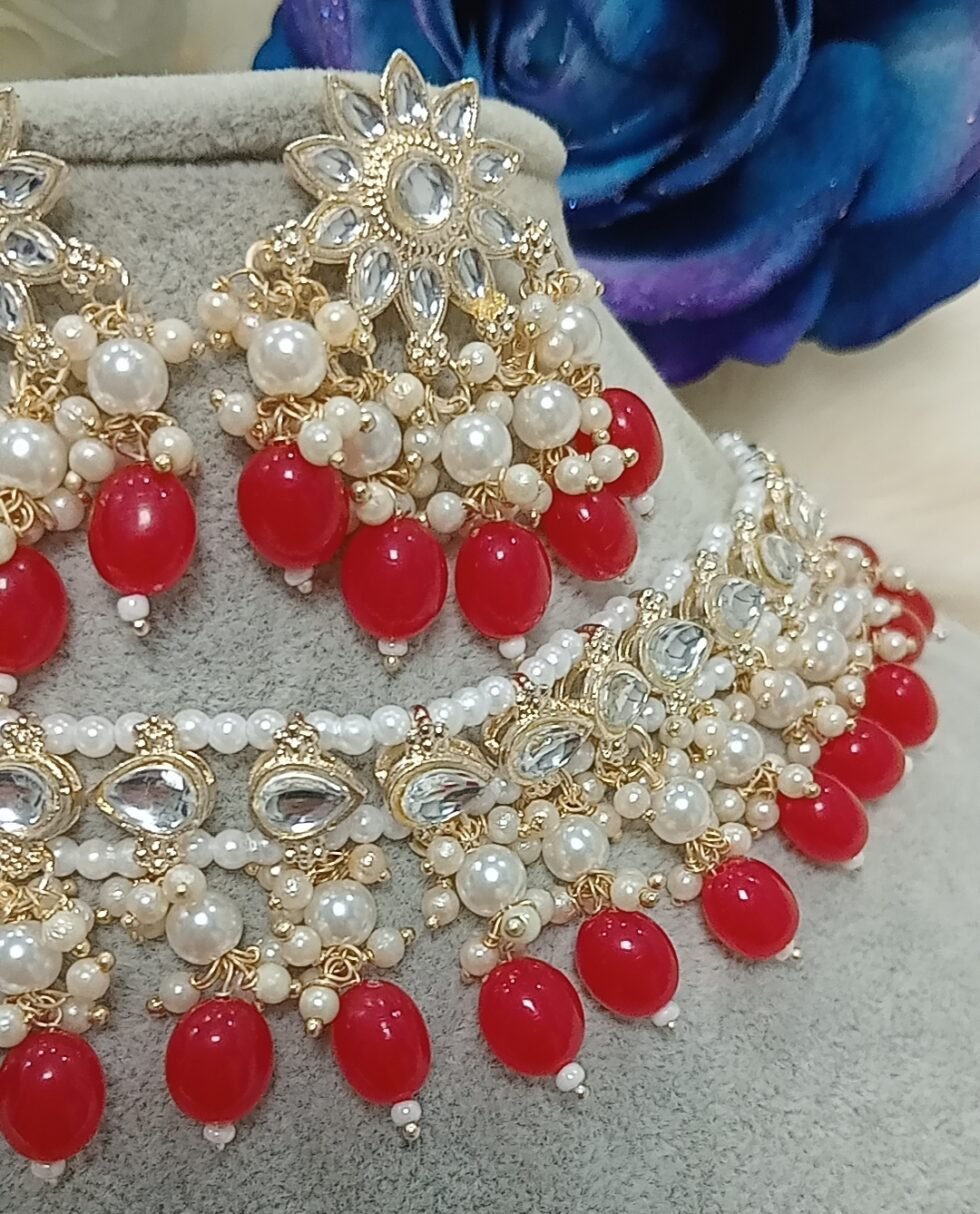Red Pearl Indian Necklace Set with Earrings